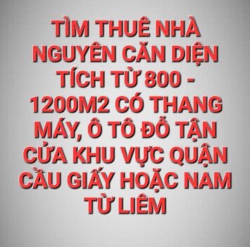 Tìm thuê nhà nguyên căn diện tích sử dụng 800-1200m2 có thang máy, ô tô đỗ tận cửa, 15-20 phòng trở lên tại khu vực quận Cầu Giấy ( cũ), Nam từ Liêm ( cũ) làm trung tâm chăm sóc sức khỏe người cao tuổi.